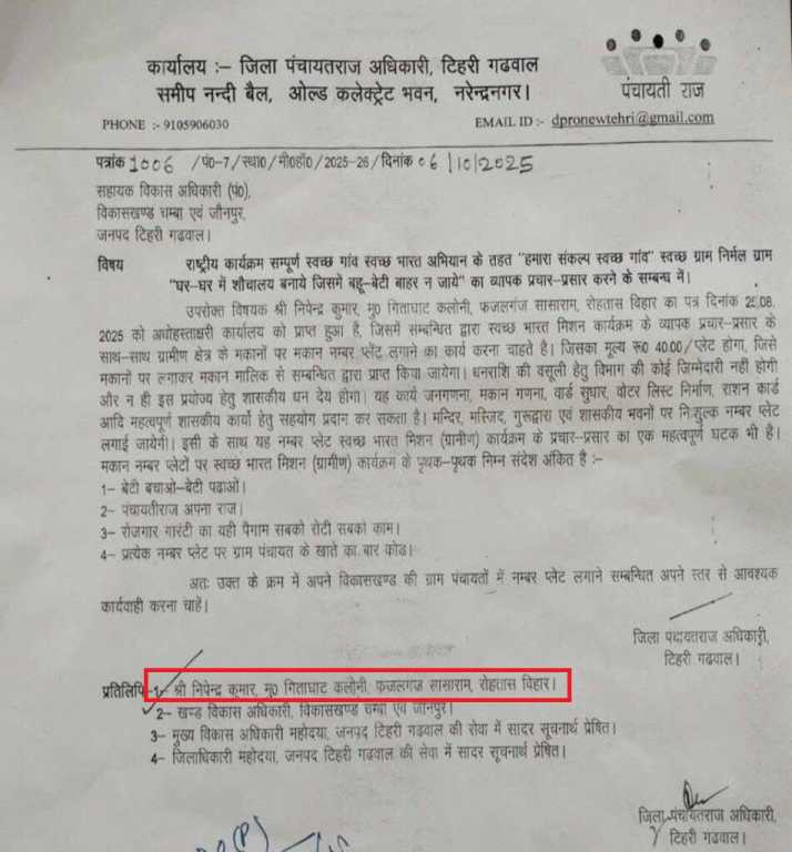 उल्लेखनीय है कि टिहरी गढ़वाल एवं उत्तरकाशी जिले के जिला पंचायतराज अधिकारियों के द्वारा ग्रामीण क्षेत्रों में स्वच्छ भारत मिशन आदि कार्यक्रमों के प्रचार-प्रसार करने हेतु मकानों पर नम्बर प्लेट लगाने का कार्य एक बाहरी व्यक्ति को देने से संबंधित पत्र सोशल मीडिया में वायरल हुए थे।