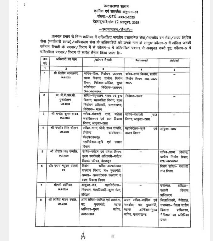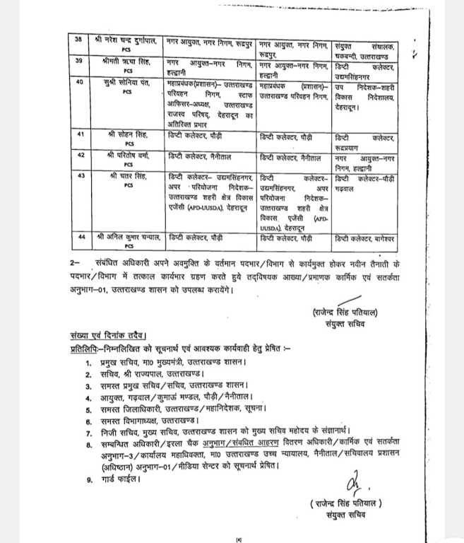 संवादसूत्र देहरादून: राज्य में आज बड़ा प्रशासनिक फेरबदल किया गया है। शासन ने 44 आईएएस, आईएफएस और पीसीएस अफसरों के तबादले किए हैं। आईएएस ललित मोहन रयाल को नैनीताल का नया जिलाधिकारी बनाया गया है। वहीं, आईएएस गौरव कुमार को जिलाधिकारी चमोली, आईएएस अंशुल सिंह को जिलाधिकारी अल्मोड़ा और आईएएस आकांक्षा को जिलाधिकारी बागेश्वर बनाया गया है। वहीं, आशीष कुमार भटगाई को जिलाधिकारी पिथौरागढ़ बनाया गया है। आईएफएस पराग मधुकर धकाते को विशेष सचिव पंचायती राज बनाया गया है।