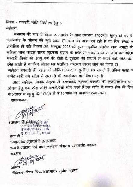 संवादसूत्र देहरादून/नई दिल्ली: निर्देशक फीचर फिल्म घश्यारी सुनील बडोनी ने उत्त्तराखण्ड में लगातार काल का ग्रास बन रही घसियारियों को लेकर ठोस नीति बनाने को लेकर मुख्यमंत्री को ज्ञापन भेजा।